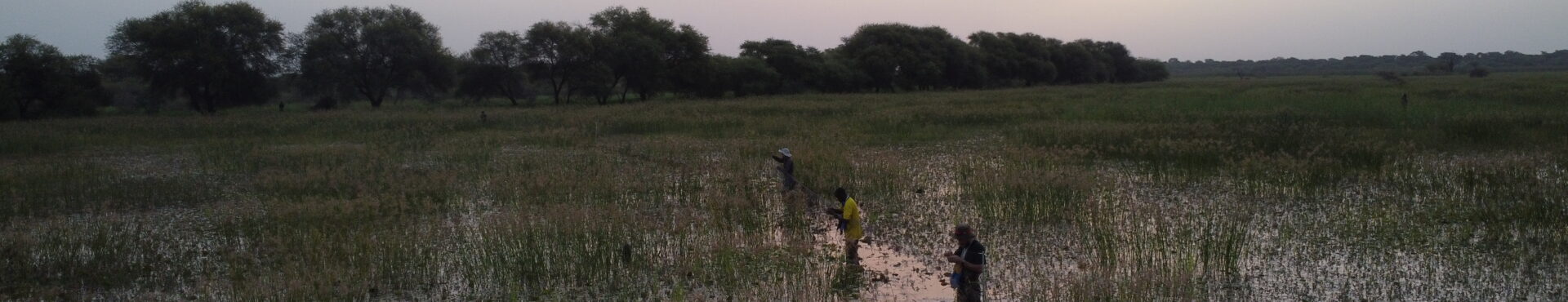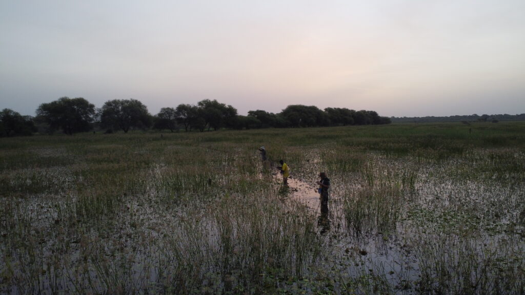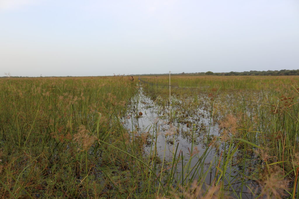 After many hours of navigating through these flooded areas under an average temperature of 40 degrees Celsius, the day was not yet over. The evening time was to install nets in areas (wetlands) that looked promising due to their vegetation. “Installing the nets is not technically complicated, but really tough physically. We had to carry the nets and wade into the wetland, which means being in water up to the chest. Add to that the dense vegetation and heat, we were covered in sweat. It was so difficult!” Vernieuwe explained. The nets were checked every half-hour at sunrise. Vernieuwe explained: