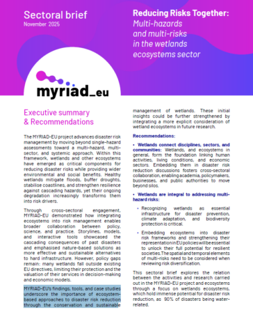 In collaboration with MYRIAD-EU project partners, we developed a sectoral brief highlighting the key role wetlands and other ecosystems play within the MYRIAD-EU project and framework, where they have emerged as critical components for reducing disaster risks while providing wider environmental and social benefits. Healthy wetlands mitigate floods, buffer droughts, stabilise coastlines, and strengthen resilience against cascading hazards, yet their ongoing degradation increasingly transforms them into risk drivers.